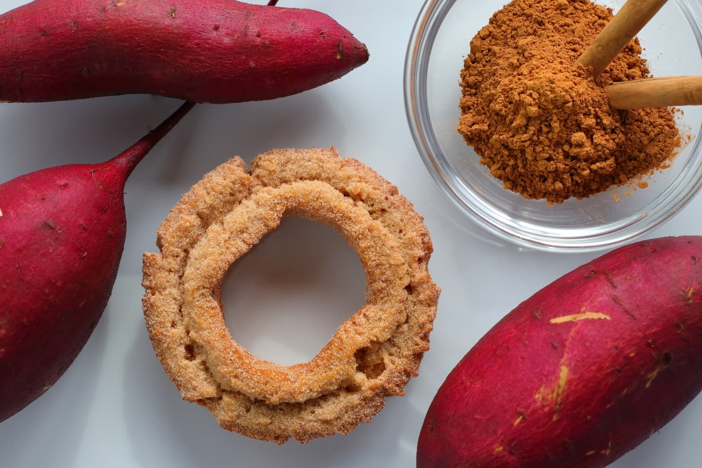 我が家の畑で元気に育ったさつまいも(シルクスイート)とシナモンを合わせて、ドーナツを作り、仕上げにシナモンシュガーをコーティング。
