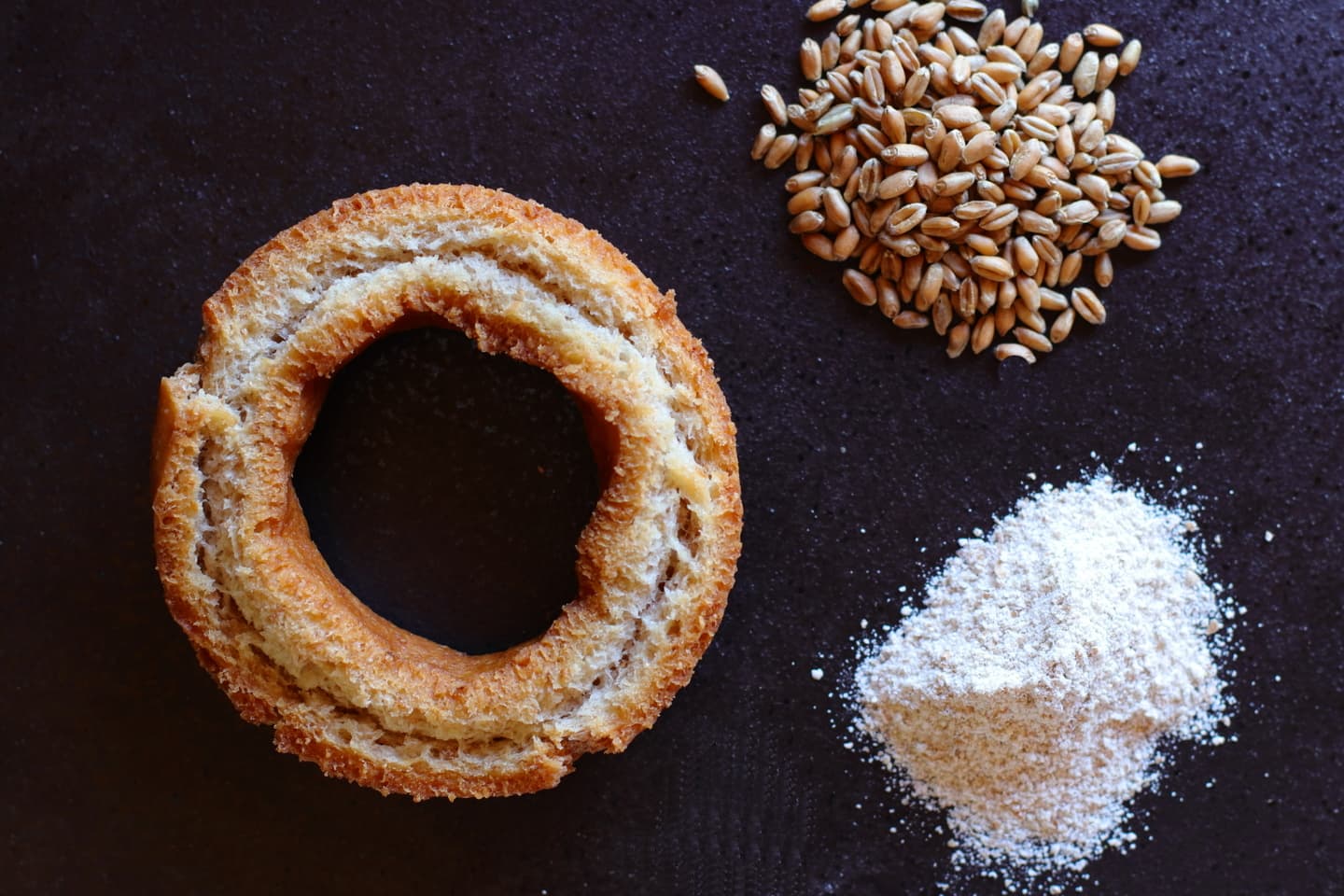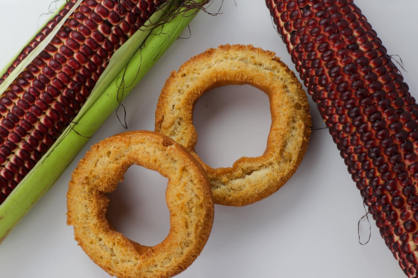 我が家で育った赤いとうもろこし(大和ルージュ)と、パルミジャーノチーズを組み合わせた、馴染みのあるお菓子のような味のドーナツ。