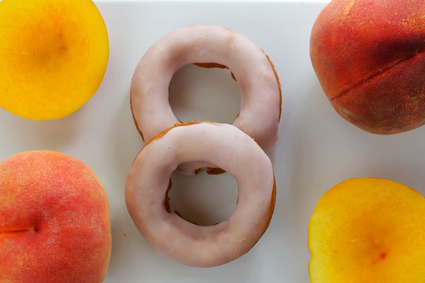 長野県産桃(黄金桃)を皮ごとと、バニラビーンズを一緒にジャムにし、生地に練り込みドーナツを作り、