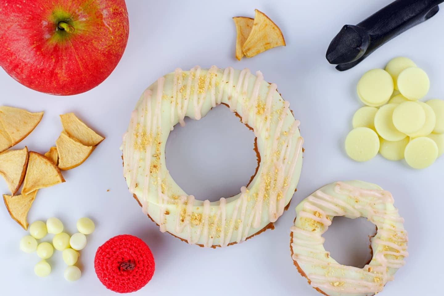 大町産紅玉りんごを使ってドーナツを作り、仕上げにホワイトチョコ、紅玉ジャムアイシングをコーティング。