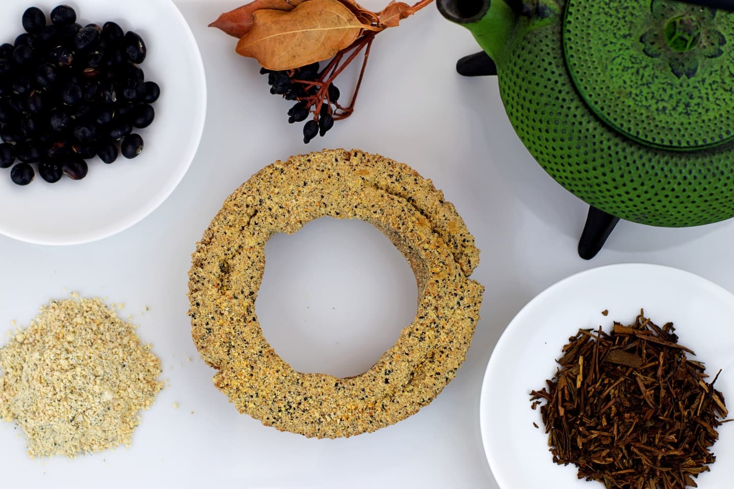 オーガニックほうじ茶と、白馬村産黒豆をきな粉にし、生地に練り込みドーナツを作り、